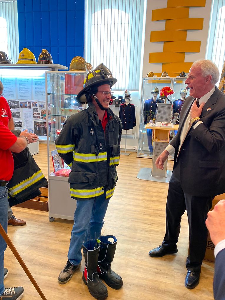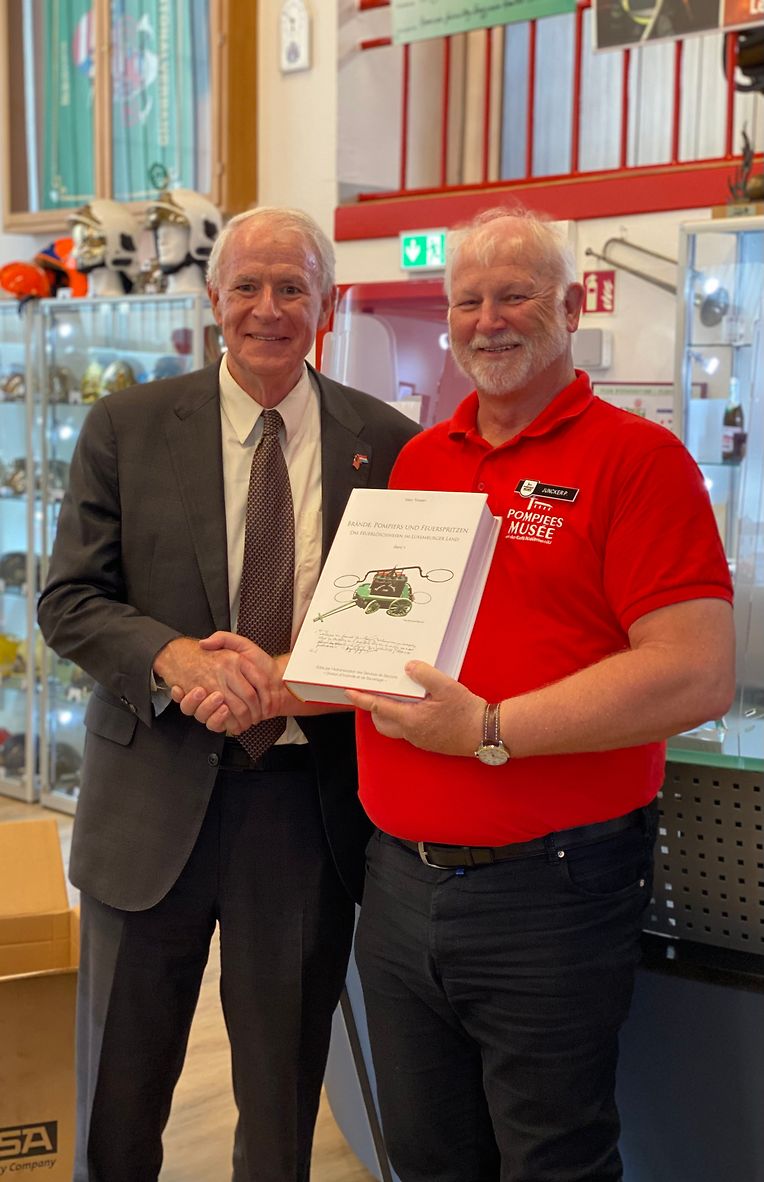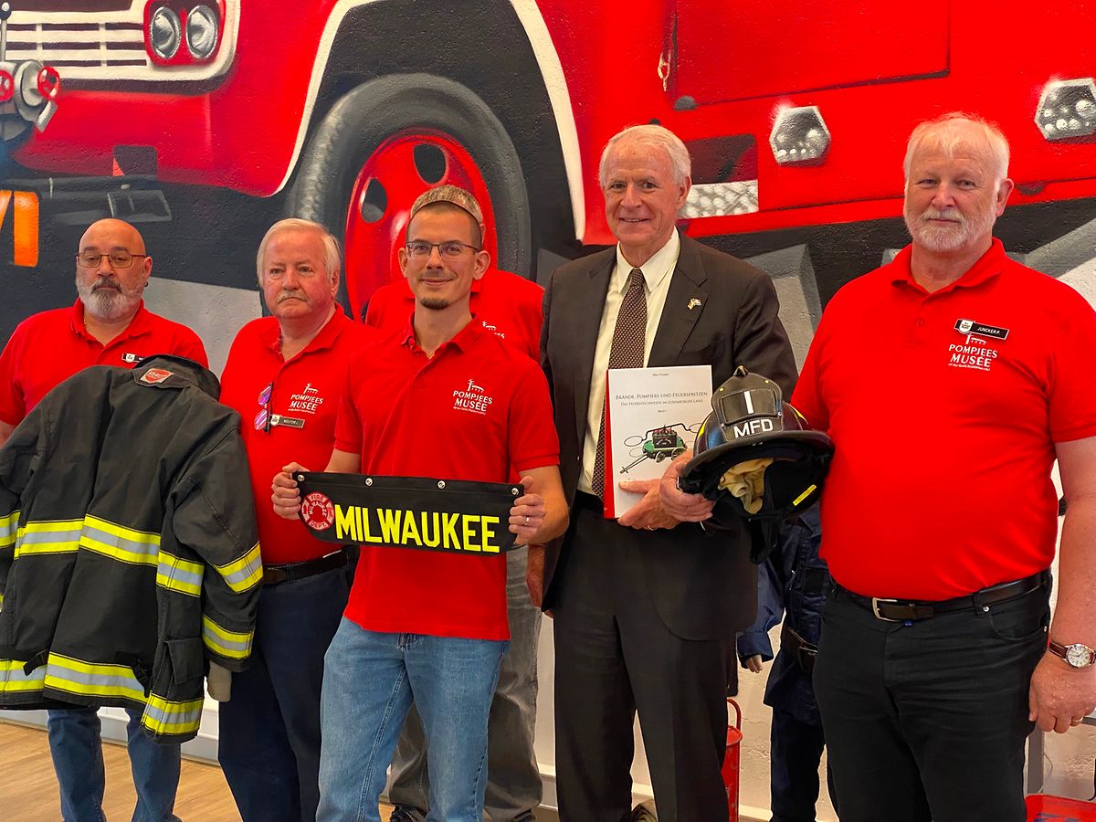 Den Dënschdeg, den 10. Mai 2022 war heiche Besuch am Pompjeesmusée vum Pompjeesverband. Den amerikanischen Ambassadeur hei zu Lëtzebuerg den H. Tom Barrett war mat senge Matarbechter aus der Ambassade dem H Craig Ferguson an der Mme Christine Lugrene am Pompjeesmusée op Visite. Nodems Gäscht eng Féierung duerch de Musée mat villen Erklärungen kritt haaten, koum ee wichtegen Deel fir Ekipp vum Pompjeesmusée. Den H Tom Barrett, deen virun senge Nomminatioun als Ambassadeur zu Letzebuerg, Buergermeeschter vu Milwaukee am Staat Wisconsin war, huet dem Pompjeesmusée eng Bunkeruniform vun de Pompjeeën vu Milwaukee geschenkt. Ze soen ass och, dass vill Letzebuerger viru laanger Zäit an de wisconsin ausgewandert sinn. Ee flotte Geste fir Frëndschaft ënnert Pompjeeën och um internationalen Niveau ze gestalten. Och eng zweet Uniform ( Dress-Uniform ) wärt an de nächste Wochen de Pompjeesmusée beräicheren. Zum Oflschluss huet de Präsident vun de Frënn vum Pompjeesmusée an der Géitz, den H. Patrick Juncker dem Tom Barrett dat flott an eemoligt Bucht iwert Pompjeeën hei zu Lëtzebuerg als Merci iwerreecht. Eng Visite déi nie vergiess wärt ginn. Thank you M Tom Barrett.