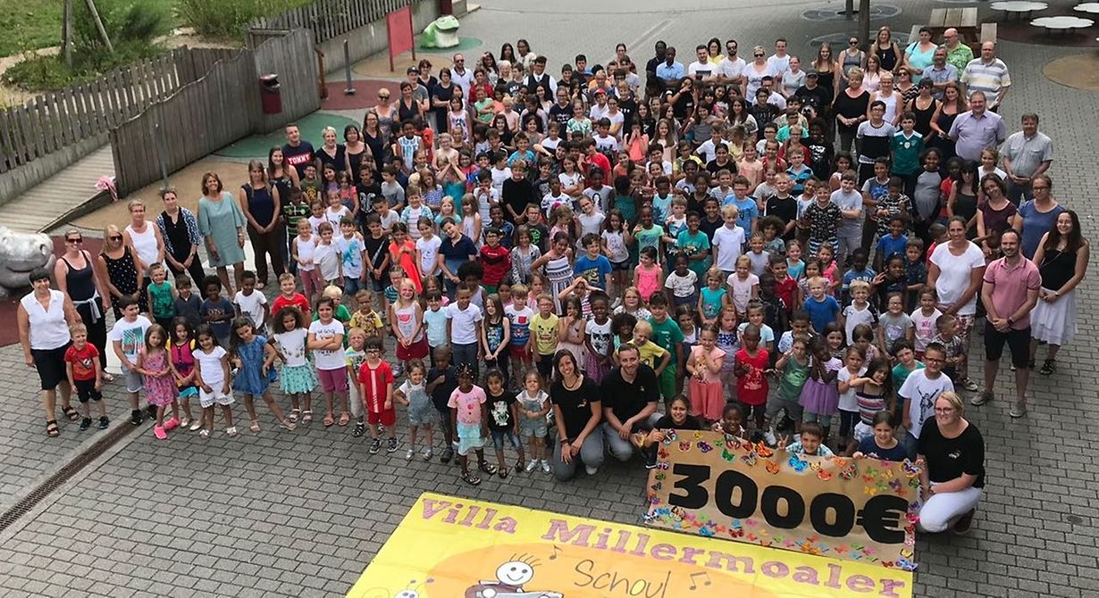 300 Schüler, Lehrer und Erzieher der „Villa Millermoaler Wooltz“ haben gemeinsam getrommelt und spenden an „Le soleil dans la main a.s.b.l.“