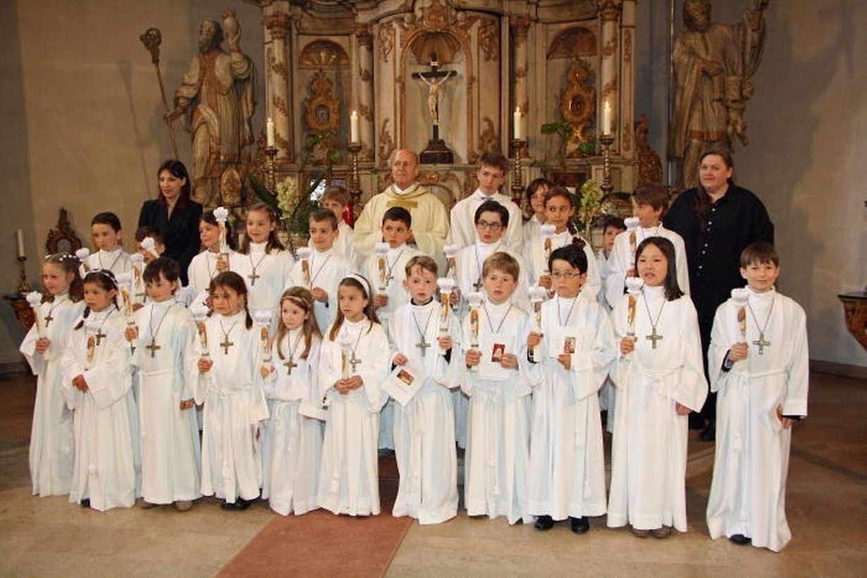 Dimanche dernier, vingt enfants de la communauté francophone de la paroisse Saint-Michel reçurent le sacrement de la Première communion en l'église Saint-Michel à Luxembourg. Mgr Mathias Schiltz célébra la sainte messe. Depuis septembre 2012, Mathias Schiltz et les assistantes pastorales Marie-Hélène Gammel et Sandra Petrovic préparèrent les enfants Oscar Bachelet, Armand Banon, Calixte de Beauregard, Gaspard Berdy, Gaspard Bouchard, Ombeline Brusset, Sophie de Busscher, Amaury Chaignon, Martin Chaignon, Alice Dubois, Héloïse Foillard, Geoffroy Lebec, Théo Malhomme, Hortense Nguyen-Guinard, Louis de Nonancourt, Clarisse de Prest, Brune Roblin, Claire Scharen-Dupont, Thibault Scharen-Dupont et Amélie Seyler durant de longs mois, accompagnés par leurs parents pour découvrir ce trésor inestimable que leur offre la table eucharistique.