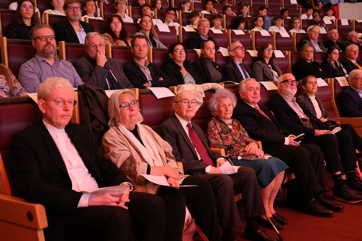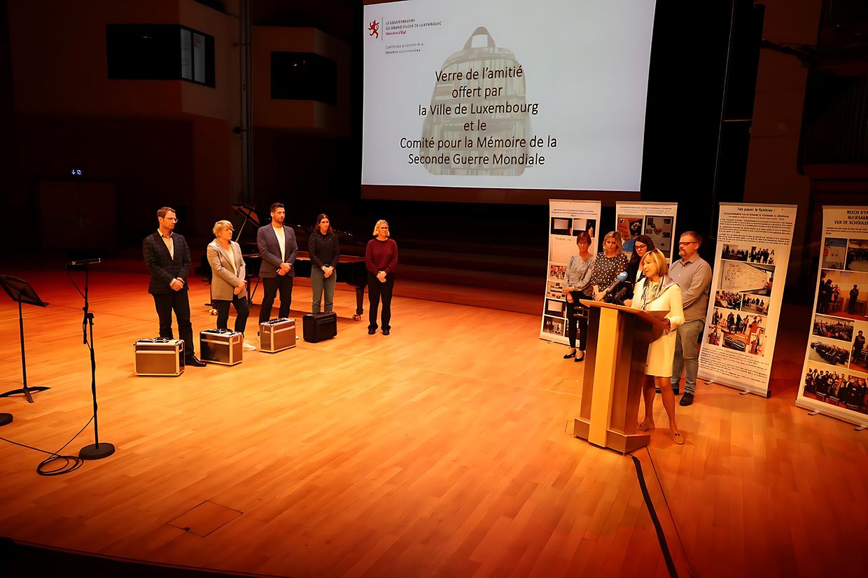 E Mëttwoch de Moien, den 23. Oktober, waren nieft dem Chamberpresident, dem Här Claude Wiseler, d’Madame Elisabeth Margue, Justizministesch als Vertriederin vun der Regierung, den Direkter vum Conservatoire, den Här Marc Meyers, den 1. Schäffen, den Här Maurice Bauer, vun der Stad Lëtzebuerg, d’Madame Simone Beck, Presidentin vun der UNESCO Kommissioun an d’Madame Mélanie Trojan, di national Koordinatorin vun den UNESCOschoulen, d’Presidentin, d’Vize-Presidenten a Membere vum CM2GM, den Direkter vum Musée National de la Résistance et des Droits Humains, Vertrieder vun den Organisatioune betreffend 2. Weltkrich.